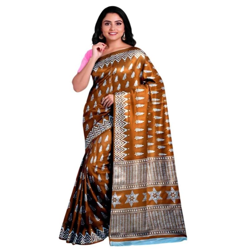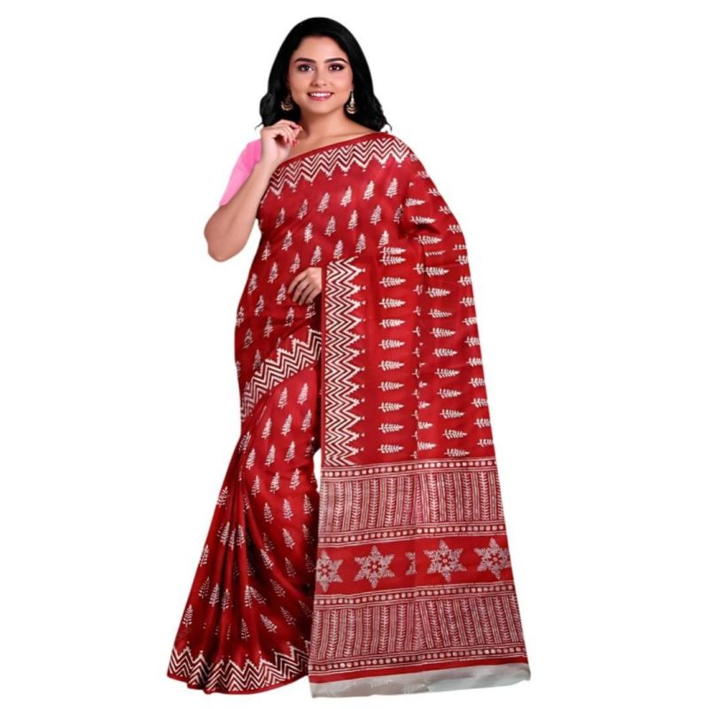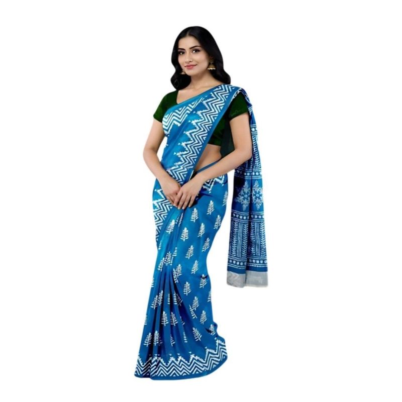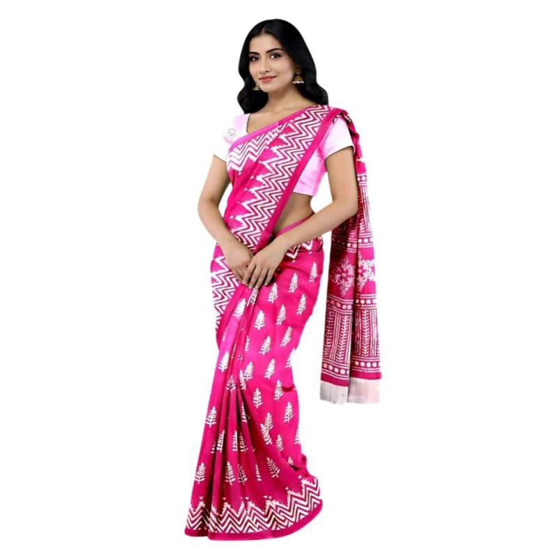 Signature Cotton Saree Collection in Pink, Red, Blue & Brown shades. Elegant white screen print motifs with bold zigzag border. Soft cotton fabric, unstitched blouse piece included – perfect for festive, casual & office wear.